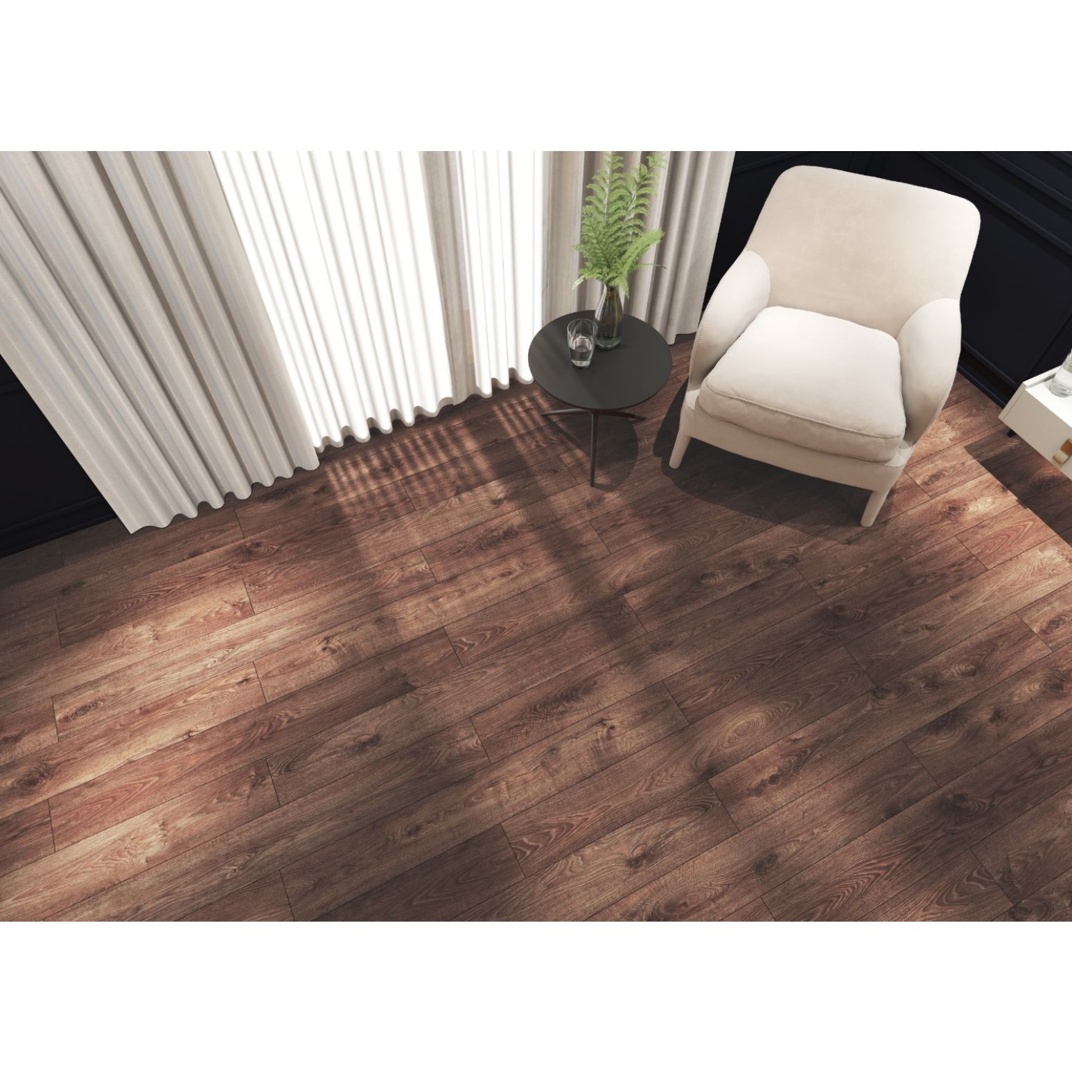 Влагостойкий ламинат Westerhof Effect Premium маркирован 33 классом эксплуатационного ресурса. У него отличное качество, повышенная прочность многослойных ламелий и гарантия от производителя на двадцать лет. У досок замковое соединение Uniclic и однополосный дизайн с имитацией фактуры натурального дерева, который подчеркивает глубокое реалистичное тиснение декоративной поверхности. Толщина панелей 12 миллиметров. Ламинированный пол быстро монтируется на деревянной, бетонной или другой черновой поверхности, в готовом виде выглядит как настоящий настил из массива натурального дерева.